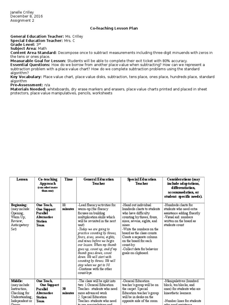assignment 2 co teaching lesson plan Lesson Plan Pedagogy
