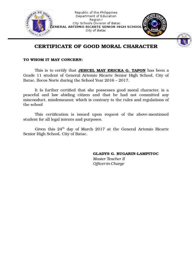 Letter Of Good Moral Character Free Printable Documents