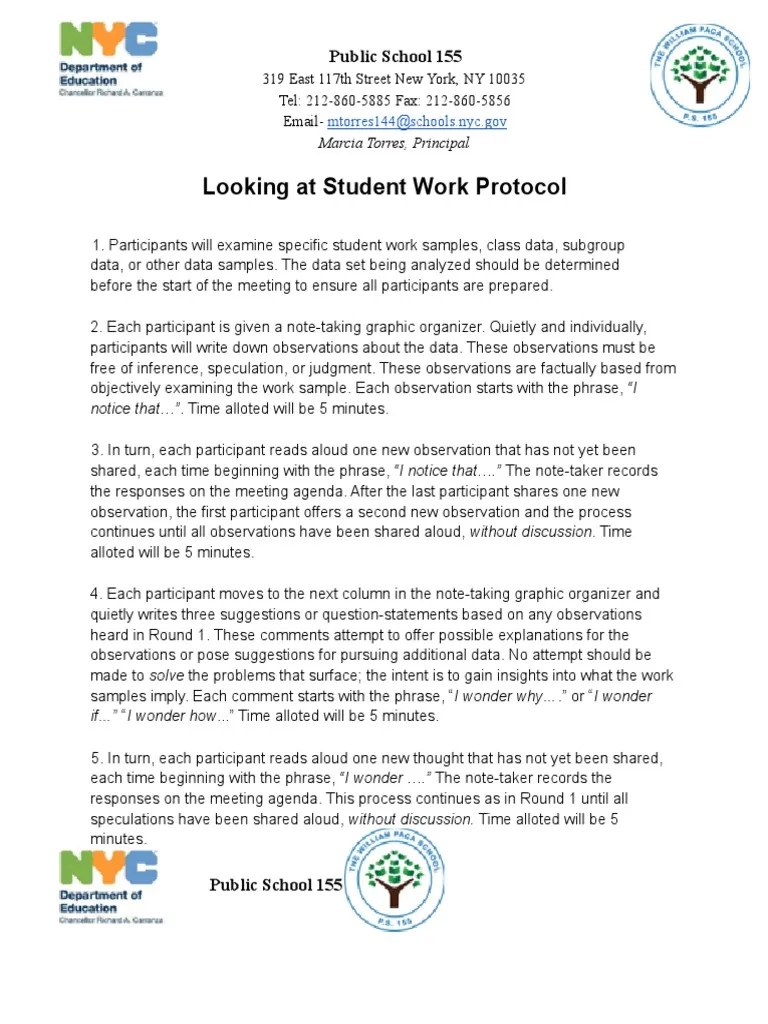 Looking at Student Work Protocol Public School 155 PDF Behavior