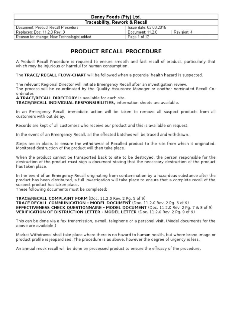 11.2.0 Product Recall Procedure.doc Logistics Inventory Free 30