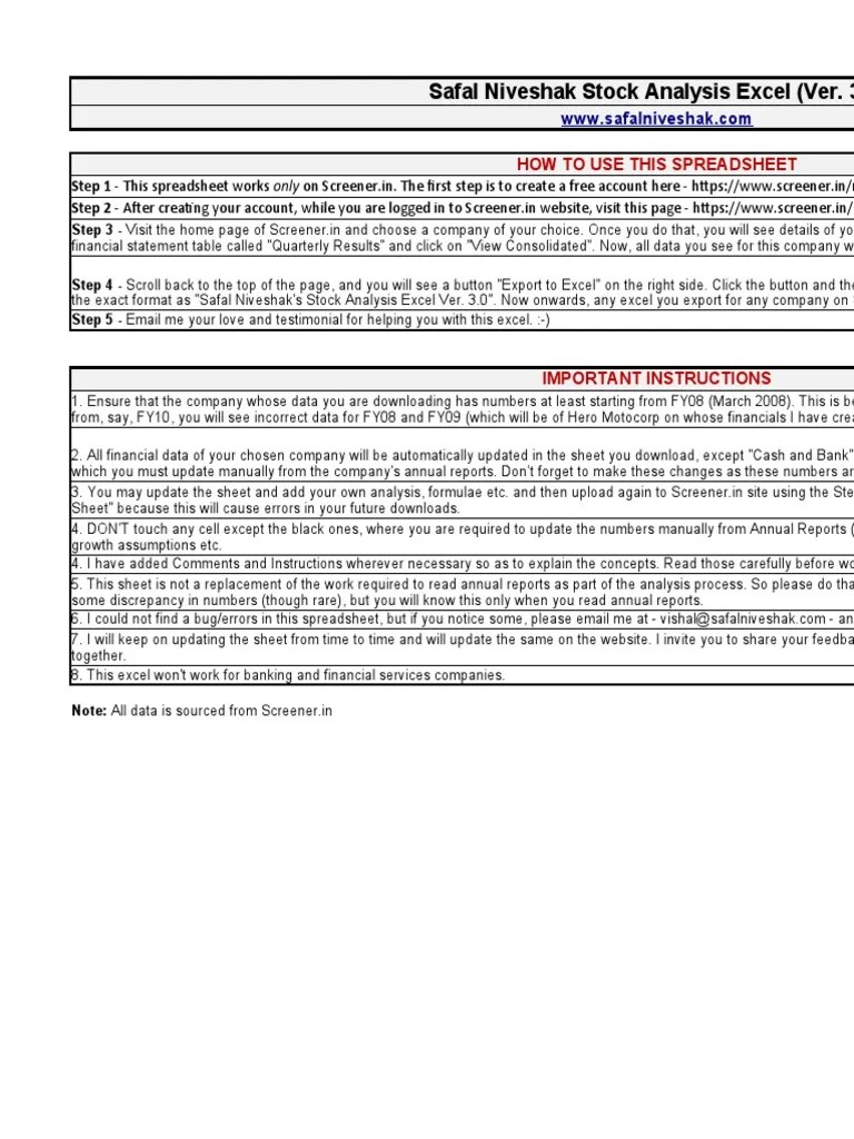 Safal Niveshak Stock Analysis Excel (Ver. 3.0) How To Use This